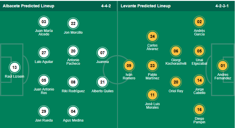 Albacete không phải đội bóng mạnh ở giải hạng nhì Tây Ban Nha, họ đứng thứ 13 mùa trước và đang có thứ hạng tương tự ở mùa giải này. Rõ ràng đội bóng của HLV Alberto González không cho thấy sự tiến bộ và cần chơi tốt hơn trong giai đoạn sắp tới bởi họ chỉ thắng 2/6 vòng gần nhất. Họ đặt mục tiêu giành chiến thắng ở vòng 20 này nhưng trước đối thủ cứng như Levante thì mọi thứ được dự đoán rất khó khăn với các cầu thủ Albacete. Nhiều khả năng đội bóng chủ nhà sẽ không có kết quả tốt ở vòng đấu này.