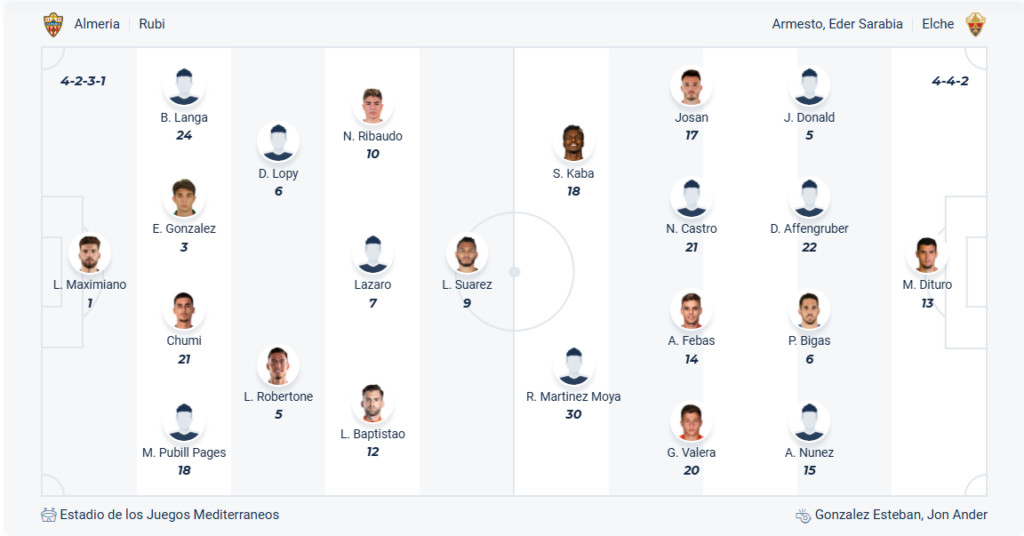Almeria mùa giải trước chơi không tốt tại La Liga nên phải xuống hạng. Đội bóng của HLV Rubi muốn ngay lập tức trở lại La Liga nên cần chơi tốt ở giải hạng dưới mùa này. Với mục tiêu đó thì vị trí thứ 5 như hiện tại là chưa đủ và đội bóng này cần chơi tốt hơn trong các trận đấu sắp tới, 4 vòng đấu liên tiếp không thắng là điều không thể chấp nhận với đội bóng muốn thăng hạng nên Almeria cần 3 điểm ở vòng 27 này. Elche không phải đội bóng yếu nhưng nhiều khả năng các cầu thủ Almeria sẽ biết cách tận dụng cơ hội để đạt được mục đích.
