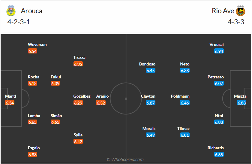 Rio Ave đứng thứ 11 mùa giải trước, rõ ràng họ không phải đội bóng mạnh của Bồ Đào Nha, tuy nhiên mùa này so với Arouca thì đội bóng của HLV Petit lại là những người có được sự ổn định hơn, họ đang đứng thứ 10 trên bảng xếp hạng. Phong độ thời gian gần đây của Rio Ave không tốt cho lắm, họ chỉ thắng 2/6 vòng gần nhất nên rất cần một kết quả tốt ở vòng đấu thứ 21 này để tối thiểu giữ được vị trí của mình. Đến làm khách trên sân của Arouca không phải trận đấu quá khó khăn với Rio Ave, nhiều khả năng đội khách sẽ có điểm ra về.