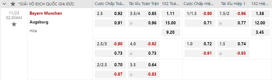 Soi kèo hiệp 1 Bayern Munich vs Augsburg: 0.91*1.0*0.72