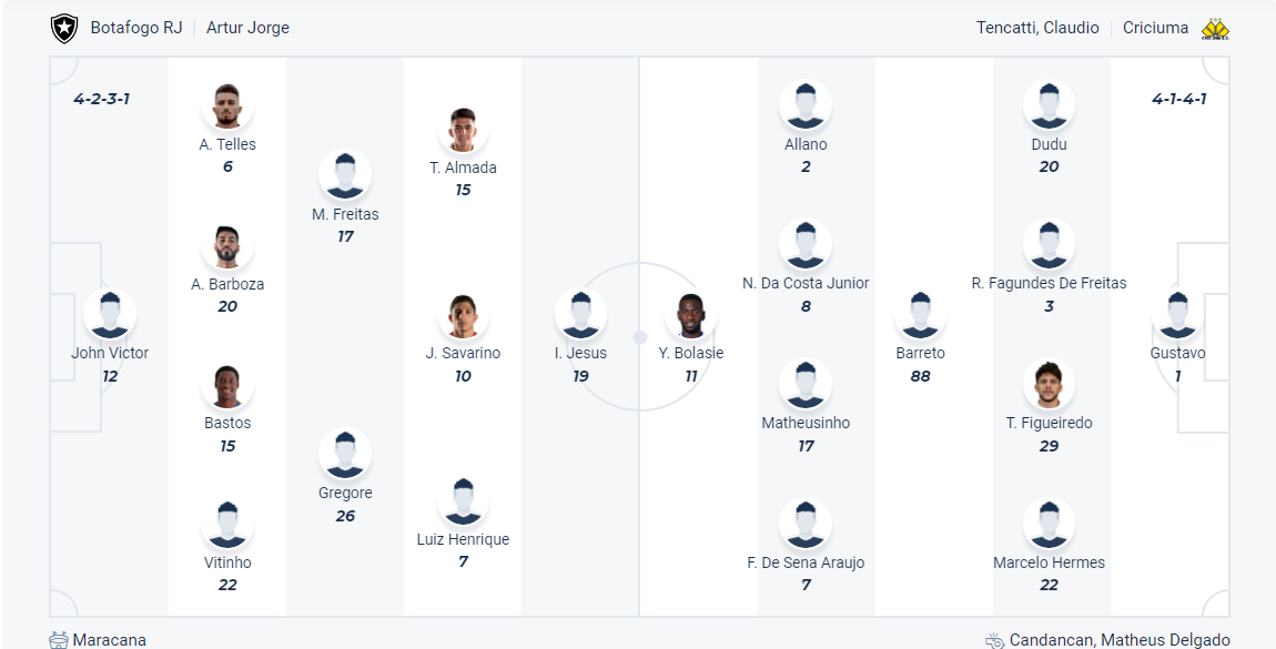 Botafogo mùa giải trước cán đích ở vị trí thứ 5, vị trí không quá tệ với chất lượng đội hình của đội bóng này. Tuy nhiên mùa giải năm nay thầy trò HLV Artur Jorge đang chơi vô cùng thăng hoa khi đang đứng đầu bảng ở thời điểm mùa giải đang bước vào giai đoạn cuối. Khoảng cách của Botafogo với đội bóng đứng sau là 3 điểm, khoảng cách không lớn nên họ cần tiếp tục giành chiến thắng để giữ vị trí đầu bảng. Chỉ phải gặp đội yếu như Criciuma là cơ hội tốt để Botafogo giành chiến thắng và nhiều khả năng đội bóng chủ nhà sẽ có được điều mình cần.