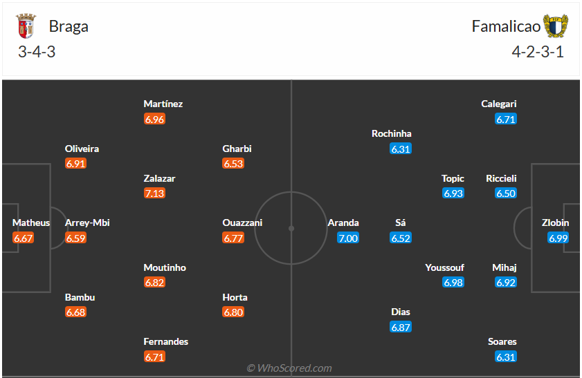 Braga vẫn luôn là đội bóng khá của Bồ Đào Nha, họ đứng thứ tư mùa giải trước. Mùa bóng năm nay thầy trò HLV Carlos Carvalhal vẫn đang chơi ổn định khi đứng thứ 5 sau 13 vòng đấu, tuy nhiên phong độ của Braga thời gian gần đây không tốt chút nào khi chỉ thắng 3/6 vòng gần nhất. Họ vừa bị cầm hòa ở vòng đấu trước nên cần một chiến thắng ở vòng đấu thứ 14 này. Đối thủ là đội bóng được đánh giá yêu hơn Famalicao nên cơ hội giành chiến thắng của của Braga là không hề ít. Nhiều khả năng đội bóng chủ nhà sẽ tận dụng được các cơ hội của mình để có 3 điểm trận này.
