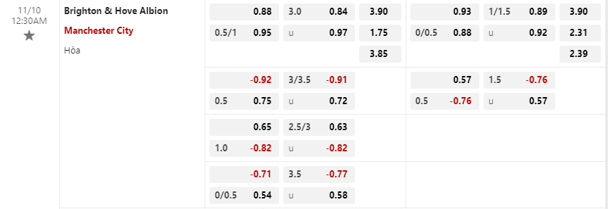 Soi kèo hiệp 1 Brighton vs Manchester City: 0.57*-0.5*0.76