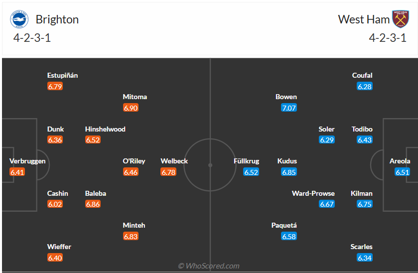 Brighton đang đứng thứ 10 trên bảng xếp hạng, vị trí không đến nỗi nào khi HLV Fabian Hürzeler có mùa giải đầu tiên cùng đội bóng này. Dù vậy cổ động viên của đội bóng này vẫn kỳ vọng đội bóng của họ có vị trí tốt hơn, và điều đầu tiên họ cần làm là chấm dứt chuỗi 5 trận liên tiếp không thắng vừa qua. Việc chỉ phài tiếp đón một West Ham cũng đang chơi không tốt là cơ hội tốt để Brighton ngắn chuỗi không thắng của mình. Nhiều khả năng đội bóng chủ nhà sẽ chơi tốt hơn ở trận đấu này và có 3 điểm trọn vẹn.
