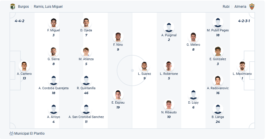 Burgos đứng thứ 9 mùa trước, mùa bóng này họ muốn làm tốt hơn nhưng chuỗi trận không tốt giai đoạn đầu đã khiến đội bóng của HLV Luis Miguel Ramis trôi xuống nửa dưới bảng xếp hạng. Với 3 chiến thắng gần đây thì Burgos mới leo lên được vị trí thứ 11 và cần tiếp tục chơi tốt để có thể có vị trí cao hơn. Vậy nên khi tiếp đón Almeria trên sân nhà ở vòng 32 thì 3 điểm là điều duy nhất mà các cầu thủ Burgos hướng đến. Trước đối thủ không có phong độ cao thì nhiều khả năng đội bóng chủ nhà sẽ có được điều mình cần.