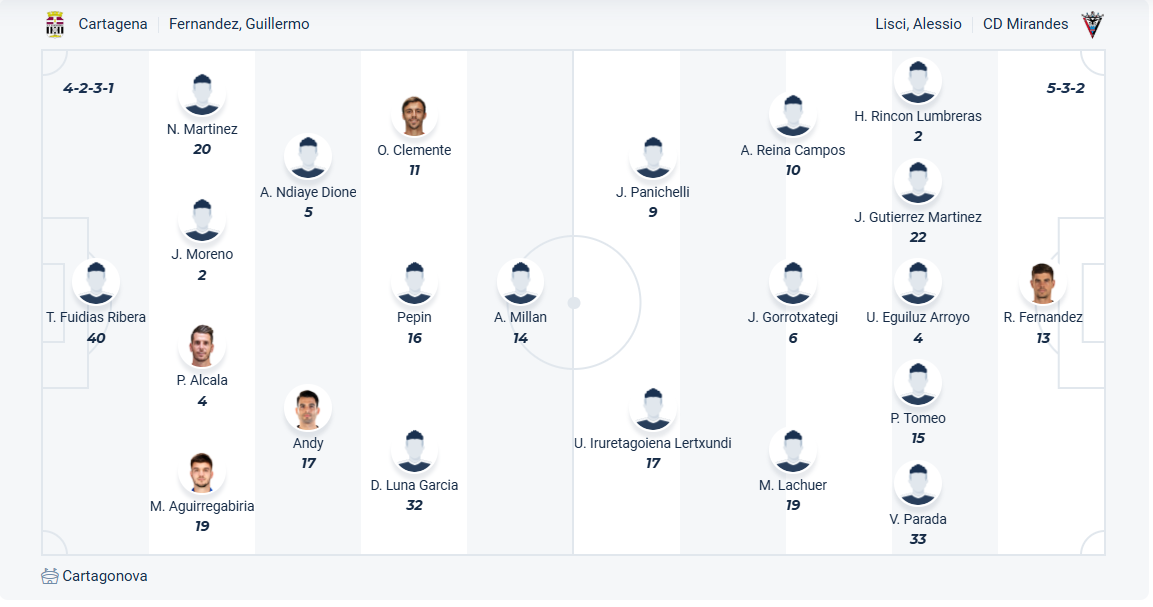 Cartagena mùa trước còn đứng thứ 14, vị trí không cao nhưng chấp nhận được với đội bóng này. Ở mùa bóng năm nay mọi thứ đã trở nên rất bi đát với đội bóng của HLV Guillermo Fernández Romo, họ đã chắc chắn xuống hang khi mà mùa giải chưa kết thúc với vị trí cuối bảng. Chính vì vậy trận đấu cuối cùng của mùa giải không còn nhiều ý nghĩa với các cầu thủ Cartagena. Vậy nên khi phải đối đầu với đội bóng đang trong top đầu như Mirandes thì xem ra cơ hội có điểm không cao.