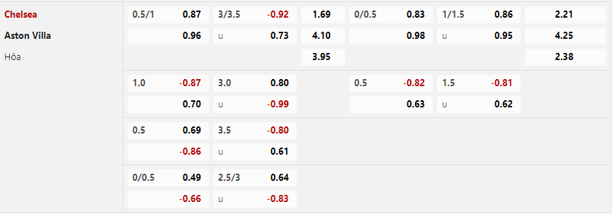 Tỷ lệ kèo Chelsea vs Aston Villa