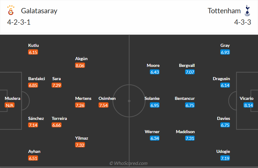 Galatasaray vô địch Thổ Nhĩ Kỳ mùa giải trước nhưng không thể lọt vào League Phase của Champions League nên chấp nhận xuống chơi ở Europa League, ở giải đấu cấp độ thấp hơn thầy trò HLV Okan Buruk chơi rất ổn khi có 7 điểm sau 3 lượt trận cùng 1 vị trí trong top 8 đội mạnh nhất. Tuy nhiên quãng đường phía trước còn rất dài và các cầu thủ Galatasaray cần tiếp tục chơi tốt để giữ vị trí của mình, đối thu của họ ở lượt trận thứ tư là đội bóng rất mạnh Tottenham, đội toàn thắng cả 3 trận nên mọi thứ được dự đoán rất khó khăn cho đội bóng của Thổ Nhĩ Kỳ. Dù được đá sân nhà nhưng khả năng Galatasaray sẽ không thể có kết quả tốt trận này.