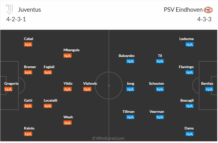 Juventus trở lại Champions League sau nhiều mùa giải lận đận, giờ vị thế của thầy trò HLV Thiago Motta không thể như cách đây 4-5 năm và chất lượng đội hình của họ cũng vậy. Tuy nhiên trong đội hình của đội bóng này vẫn còn những cầu thủ chất lượng và đương nhiên vẫn được đánh giá cao hơn đội bóng đến từ Hà Lan như PSV. Chính vì vậy đội bóng Italia đặt mục tiêu giành chiến thắng trận này để có thể thuận lợi trong việc giành vé đi tiếp, đây không phải điều khó thực hiện nếu Juventus chơi đúng với khả năng của mình.