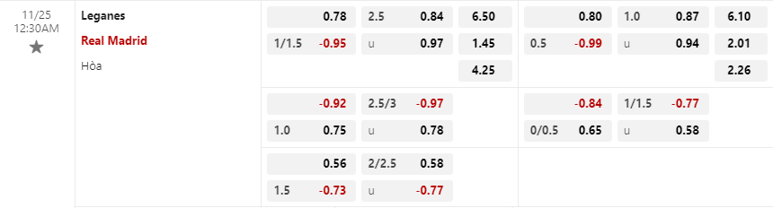 Soi kèo hiệp 1 Leganes vs Real Madrid: 0.80*-0.5*0.99