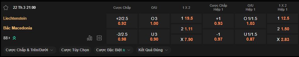 Soi kèo hiệp 1 Liechtenstein vs Macedonia: 1.00*0/0.5*0.89