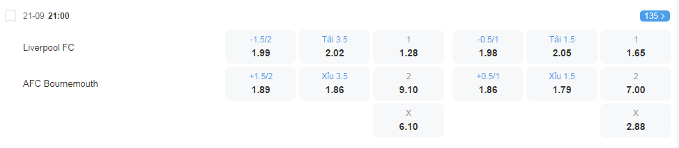 Tỷ lệ kèo Liverpool vs Bournemouth