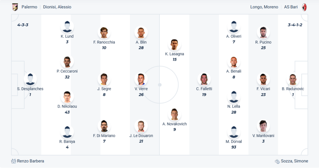 Palermo đứng thứ 6 mùa giải trước, vị trí không đến nỗi nào và họ đặt mục tiêu mùa giải này chơi tốt hơn để hy vọng vào tấm vé thăng hạng. Tuy nhiên mọi thứ đang diễn ra rất tệ với thầy trò HLV Alessio Dionisi khi họ chỉ thắng 1 trong 6 vòng gần nhất và để thua cả 3 trận đấu gần đây. Vị trí thứ 12 như hiện tại là không thể chấp nhận được và các cầu thu Palermo cần ngay lập tức giành chiến thắng để cải thiện thứ hạng của mình. Tuy nhiên trước đối thủ khá khó chịu như Bari ở vòng đấu thứ 19 thì nhiều khả năng Palermo sẽ chỉ có được kết quả hòa.