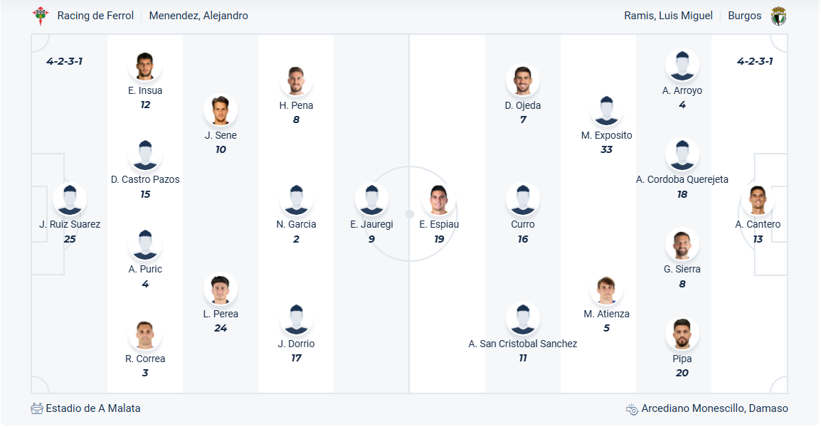 Racing Ferrol đứng thứ 10 mùa giải trước, vị trí không hề tệ so với tiềm lực của đội bóng bóng này. Tuy nhiên mùa bóng năm nay họ không còn chơi tốt như trước nữa, đội bóng của HLV Alejandro Menéndez đã tụt xuống thứ 20 sau chuỗi 4 trận thua liên tiếp và thật sự có nguy cơ xuống hạng nếu không làm tốt hơn trong giai đoạn còn lại của mùa giải. Họ cần giành chiến thắng khi đón tiếp Burgos ở vòng đấu 29 này, tuy nhiên đối thủ không hề dễ chơi nên khả năng Racing Ferrol sẽ không có được kết quả tích cực.