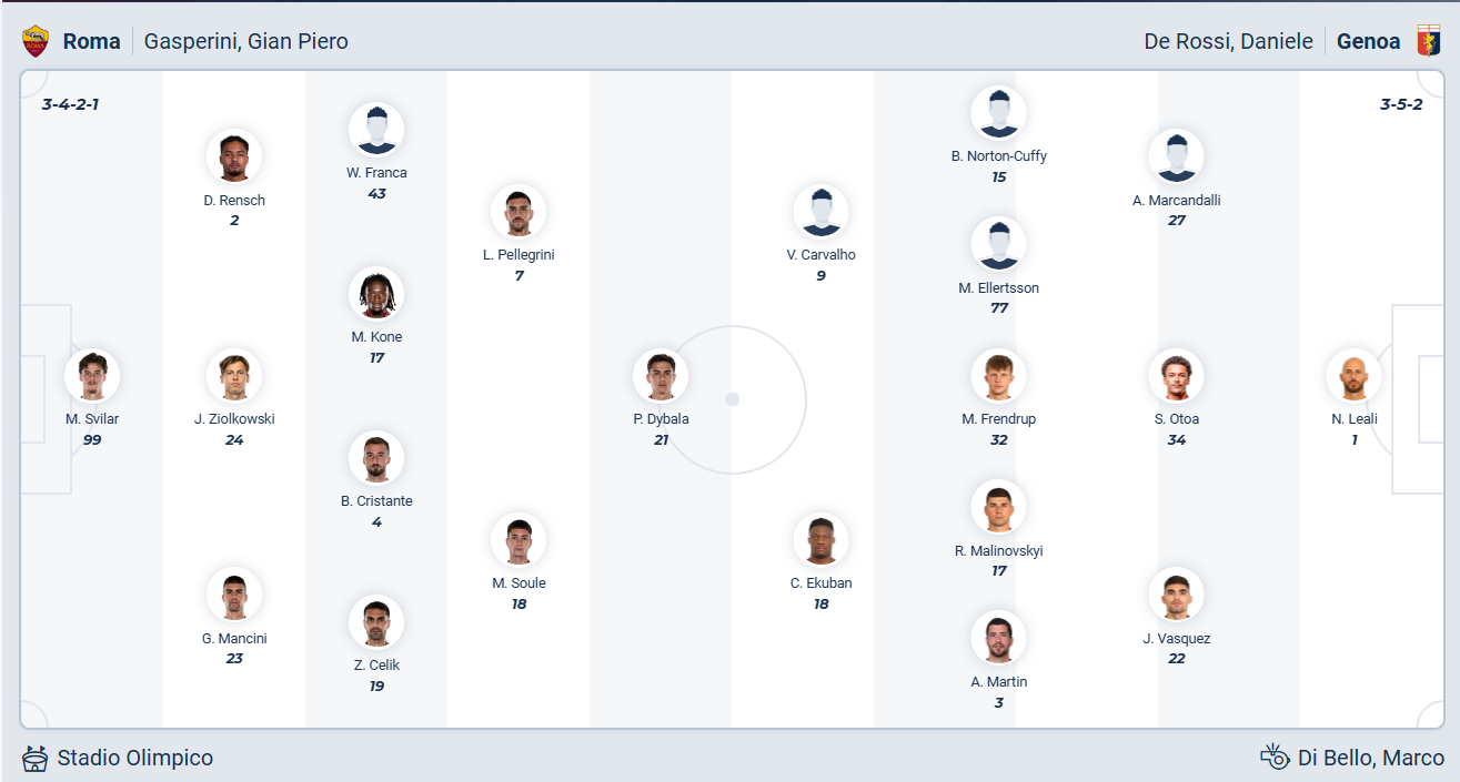 Roma từng đứng đầu bảng nhưng việc để thua 3/5 trận gần nhất khiến họ tụt xuống thứ tư trên bảng xếp hạng với 3 điểm kém đội đứng đầu. So với mục tiêu top 4 hồi đầu mùa thì đây vẫn là vị trí rất ổn nhưng rõ ràng đội bóng của HLV Gasperini không thể hài lòng với phong độ thời gian gần đây. Sau khi để thua ở vòng đấu trước, các cầu thủ Roma cần trở lại với mạch thắng để cạnh tranh cho vị trí trong top đầu. Đây không phải trận đấu khó bởi Genoa không phải đội bóng mạnh, nhiều khả năng Roma sẽ chơi đủ tốt để có 3 điểm trọn vẹn.