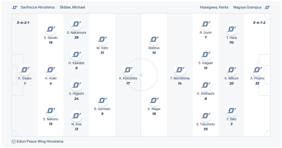 Sanfrecce Hiroshima đang đứng thứ thứ 3 trên bảng xếp hạng, họ kém đội đầu bảng 5 điểm và đá ít hơn 1 trận. Với tình thế hiện tại thì cơ hội để cạnh tranh vị trí đầu bảng của đội bóng này vẫn là rất sáng và điều quan trọng các cầu thủ Sanfrecce Hiroshima phải làm tốt nhiệm vụ của mình trong từng trận đấu, họ cần giành chiến thắng vòng đấu tới và hạn chế mất điểm. Chính vì vậy khi tiếp đón Nagoya Grampus thì 3 điểm là điều duy nhất Sanfrecce Hiroshima hướng đến. Với đội hình mạnh hơn thì xem ra mục tiêu này không khó thực hiện.
