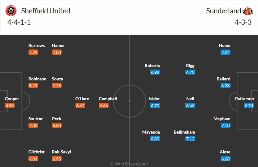 Sunderland đứng thứ 16 mùa trước, vị trí không cao nhưng ổn so với đội bóng mới thăng hạng. Mùa này đội bóng của HLV Régis Le Bris đang chơi tiến bộ rất nhiều khi tạm thời đứng thứ 3 trên bảng xếp hạng, nếu không để hòa quá nhiều những vòng gần nhất thì vị trí của Sunderland phải ở đầu bảng. Sau khi hòa liên tiếp 5 trận, các cầu thủ Sunderland muốn có chiến thắng ở vòng đấu thứ 18 này. Tuy nhiên họ lại phải đến làm khách trên sân của đội đầu bảng Sheffield United nên mọi thứ không hề dễ dàng, nhiều khả năng Sunderland sẽ tiếp tục có trận hòa thứ 6 liên tiếp.