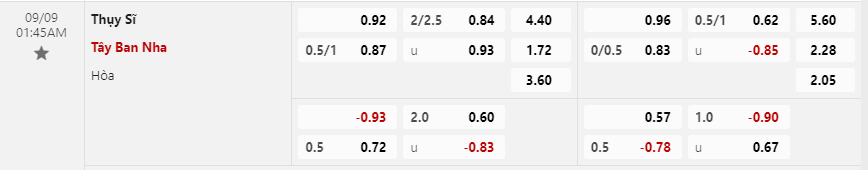 Tỷ lệ kèo Thụy Sĩ vs Tây Ban Nha
